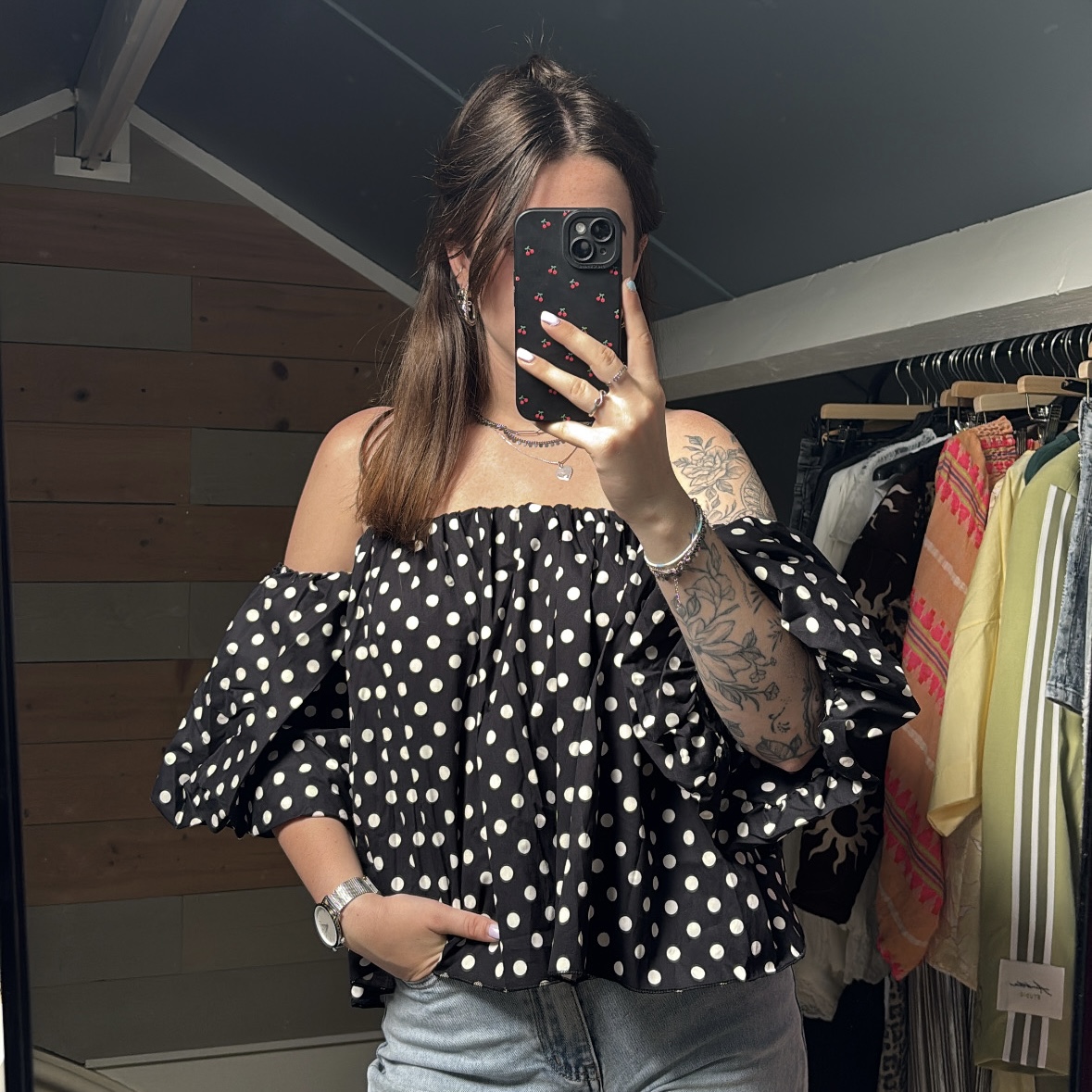 • Off-shoulder top met stippen